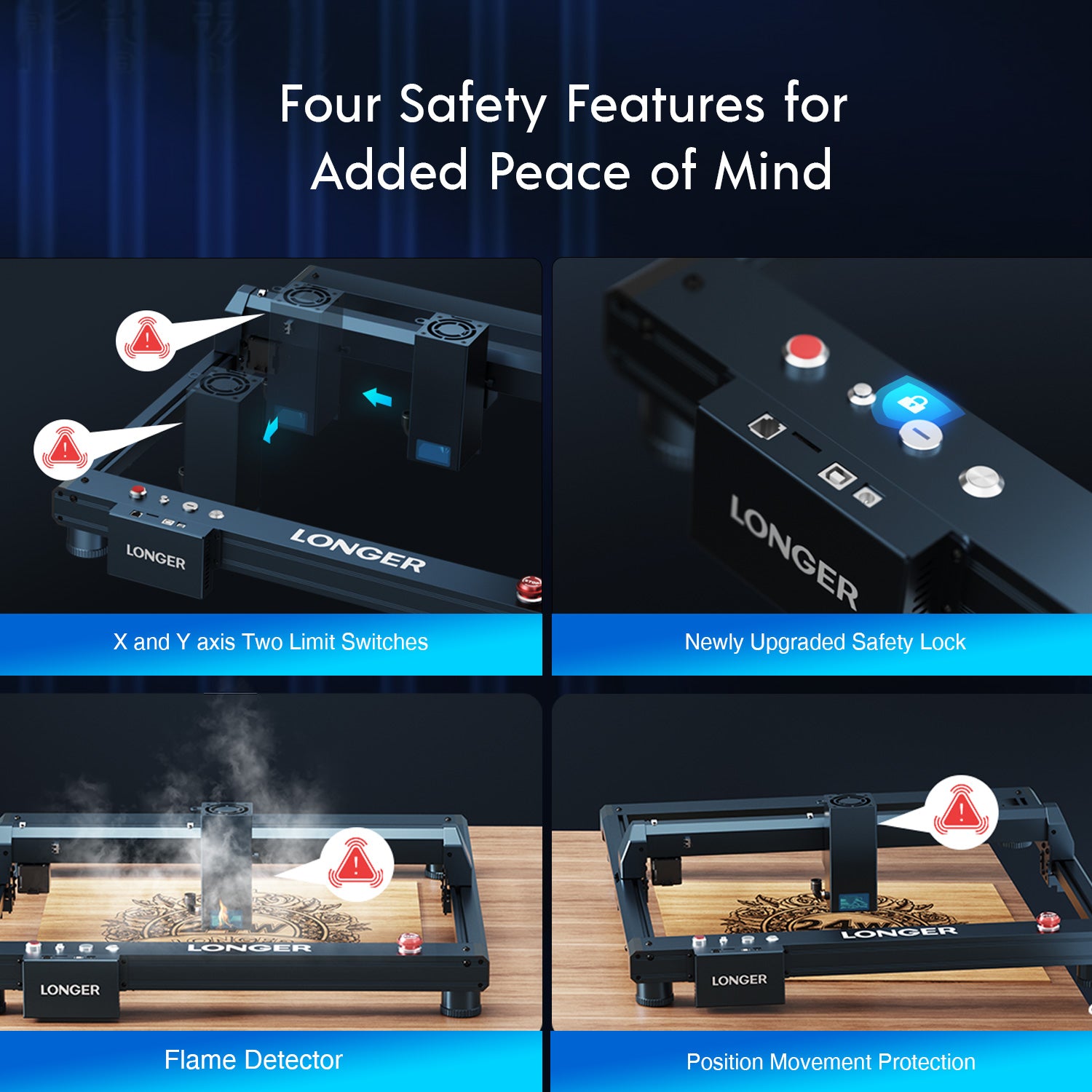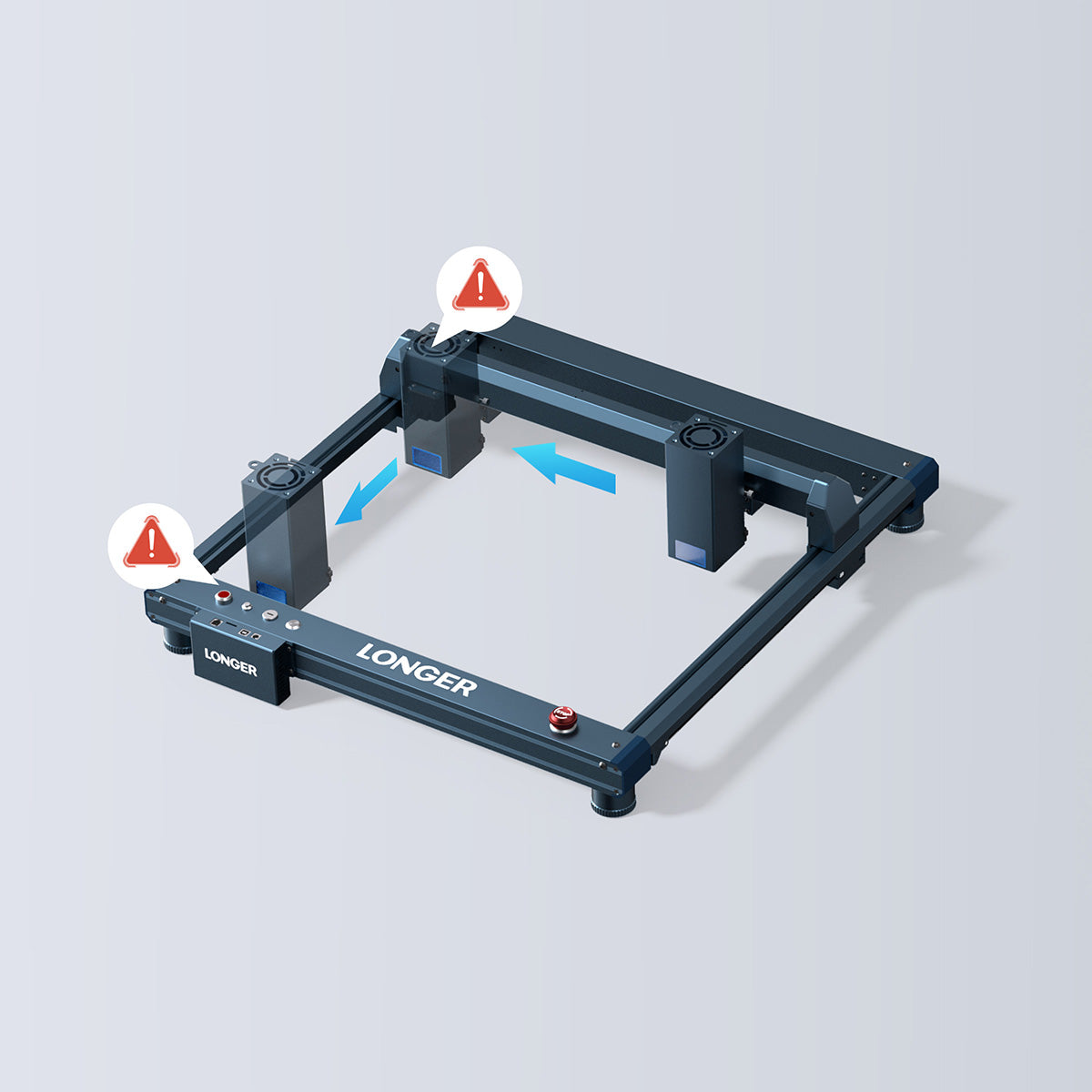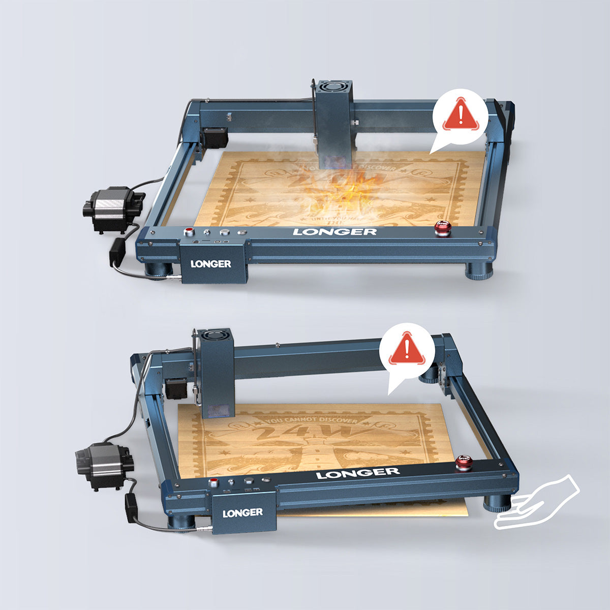 Longer LaserB1 has 8 safety protection functions, namely moving/flame/offline/stationary/safety lock/eye protection/emergency stop button/reset to zero. And the laser head automatically returns to zero to avoid burning out during ignition