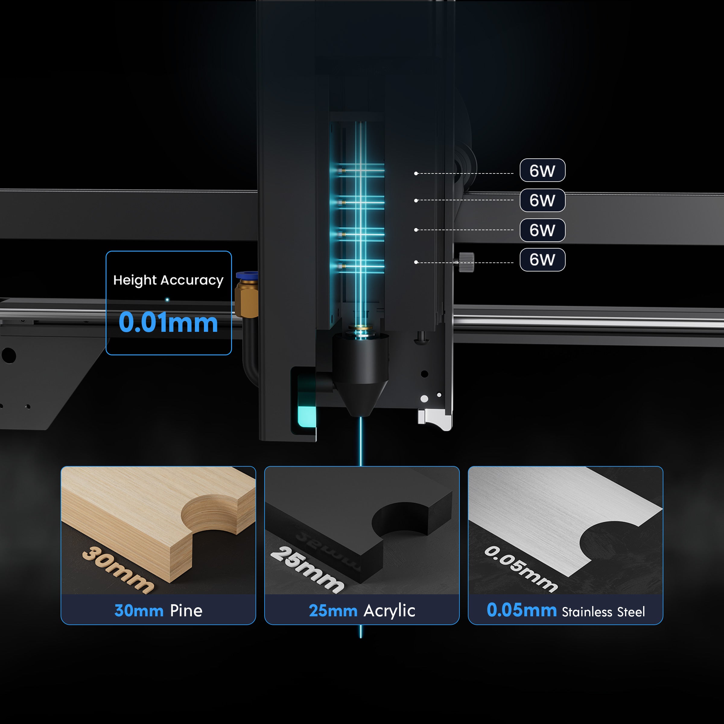 • Quad-Core Diode Laser, 22-24W Output, Capable of cutting through materials like 25mm pinewood, 35mm acrylic and 0.05mm stainless steel