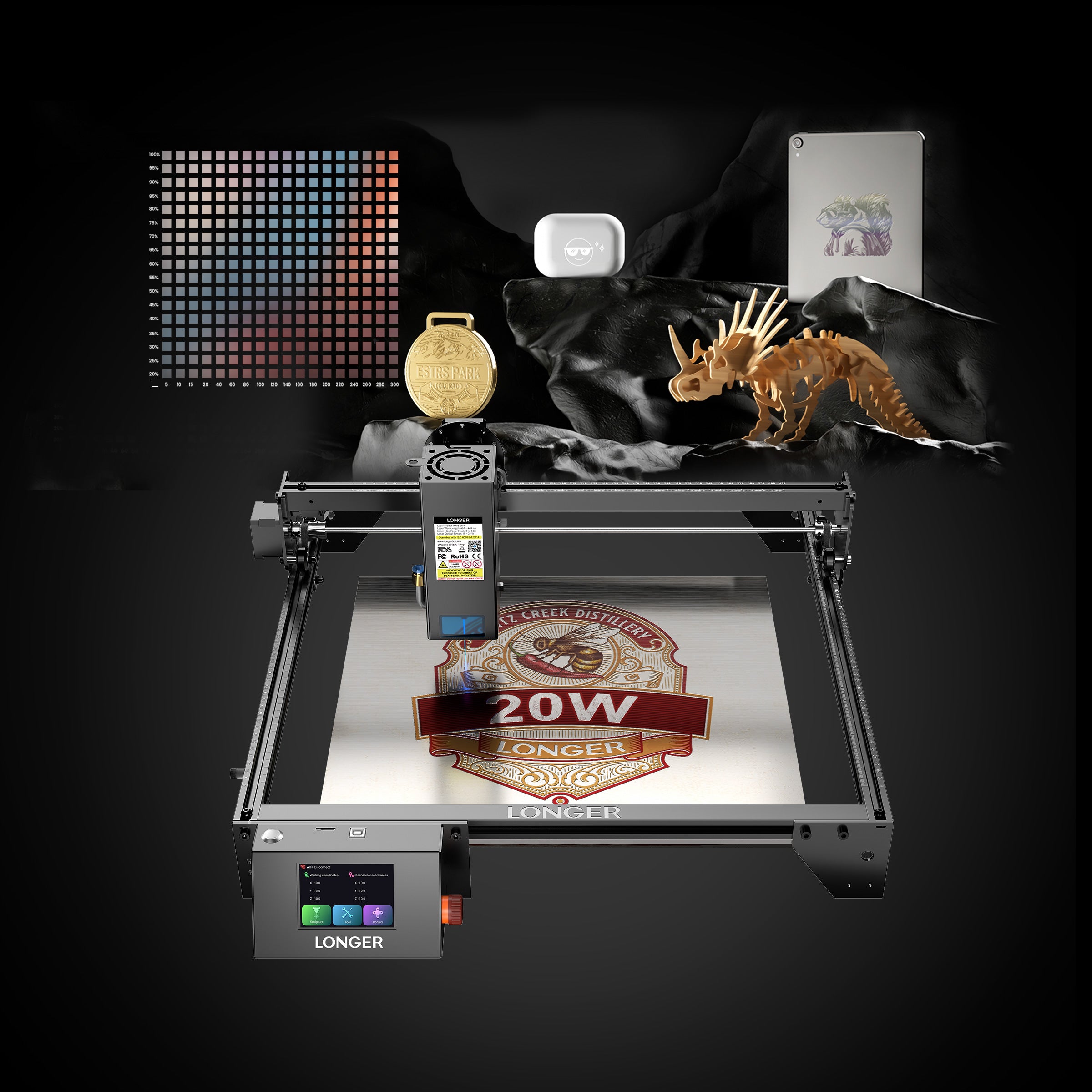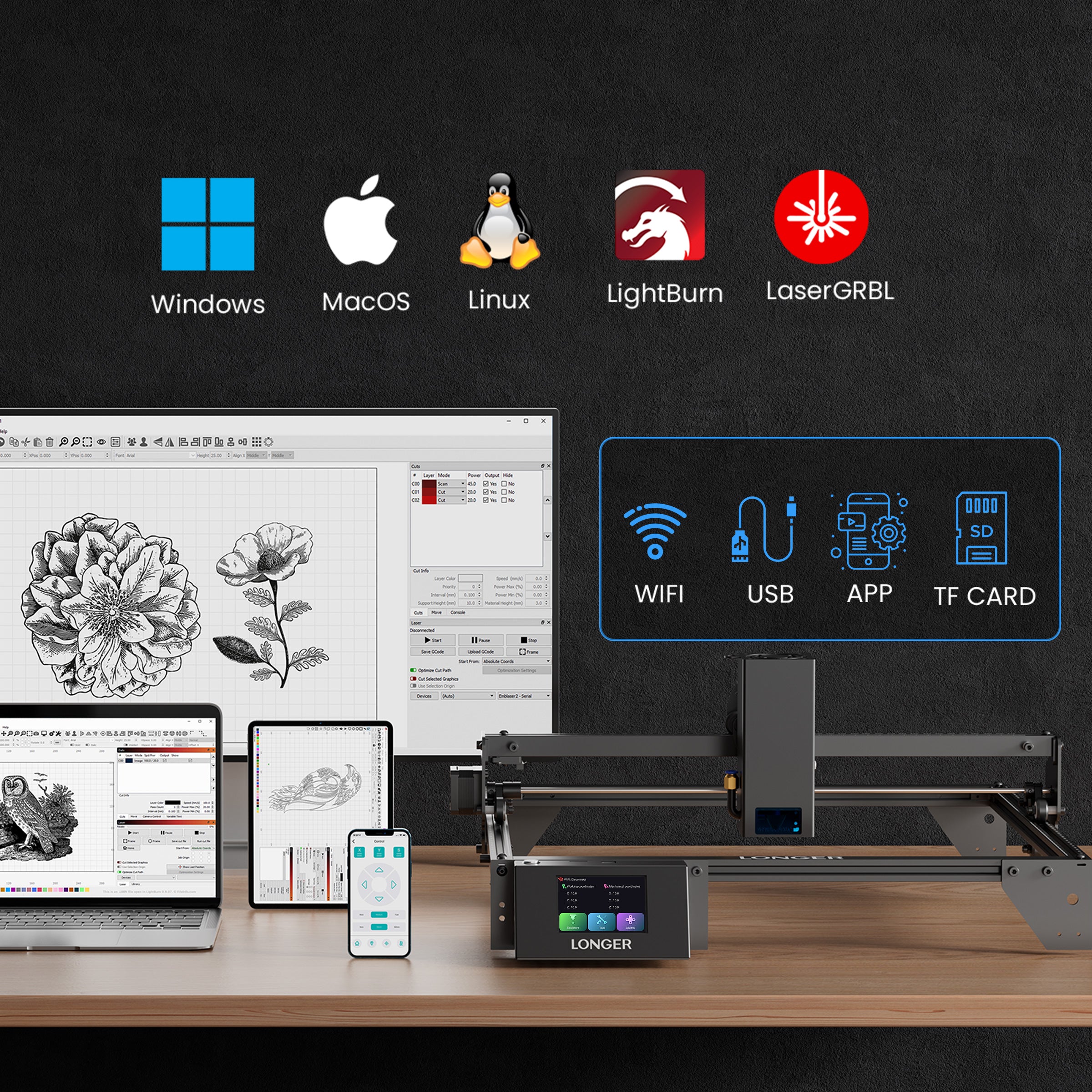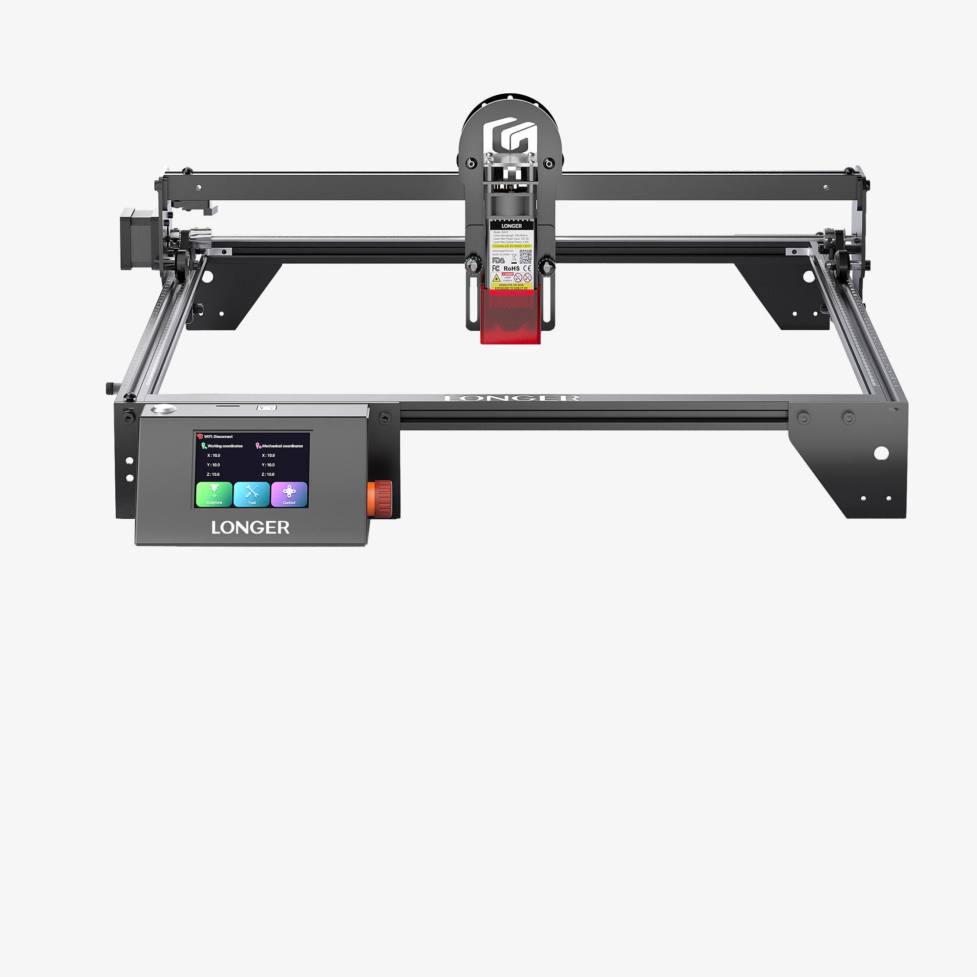 The RAY5 comes equipped with a 3.5-inch touch screen, offering seamless navigation and control. It supports three connection methods: USB, TF card, and WIFI offline mode. Additionally, the mobile app "MKSLaser," available for both Android and iOS devices, provides users with the convenience of controlling the Longer Ray5 directly from their smartphones. Beyond mere control, this app enables users to edit images and adjust engraving parameters on the go, ensuring flexibility and efficiency in their engraving tasks