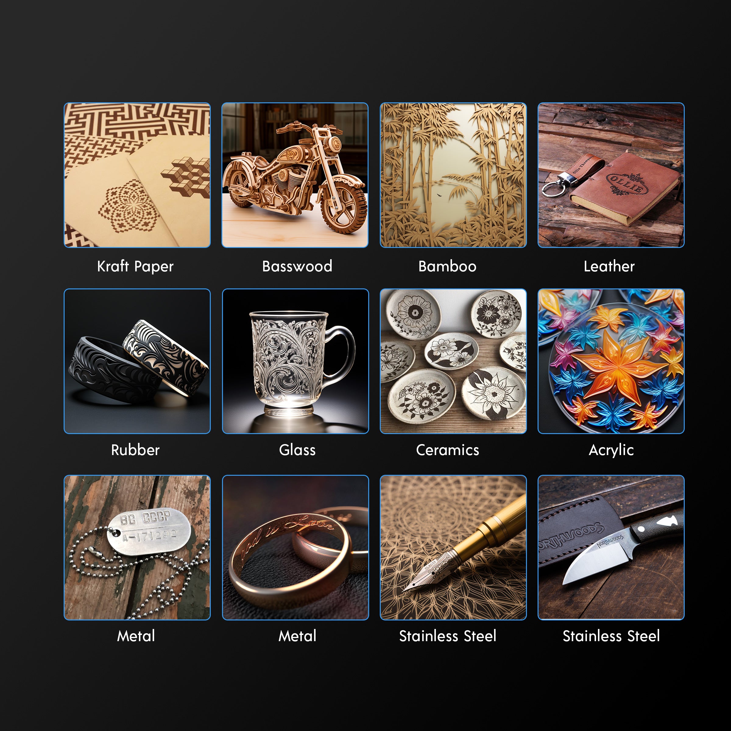 Supported engraving materials: all wood, paper, plastic, leather, PCB board, aluminum oxide, non-reflective coating and painted metal, etc