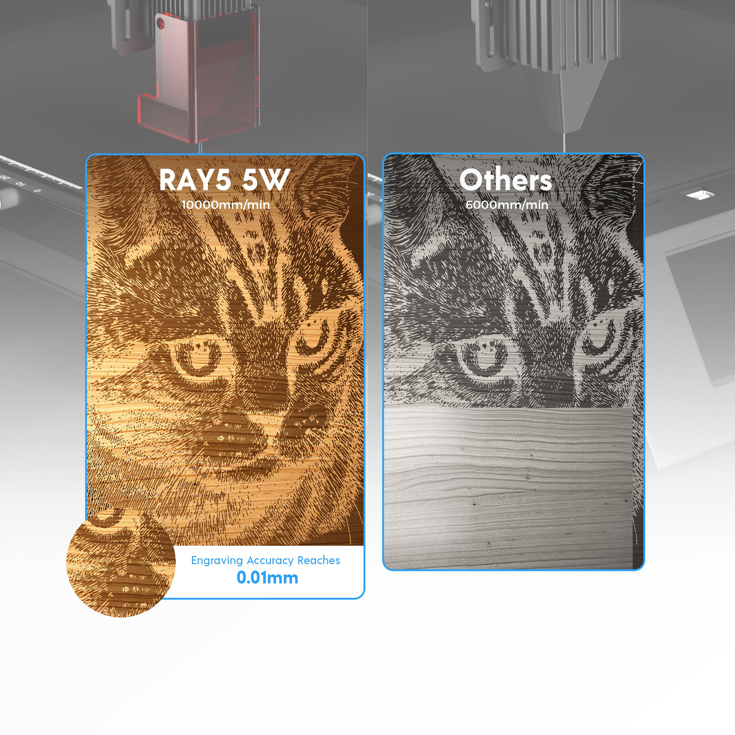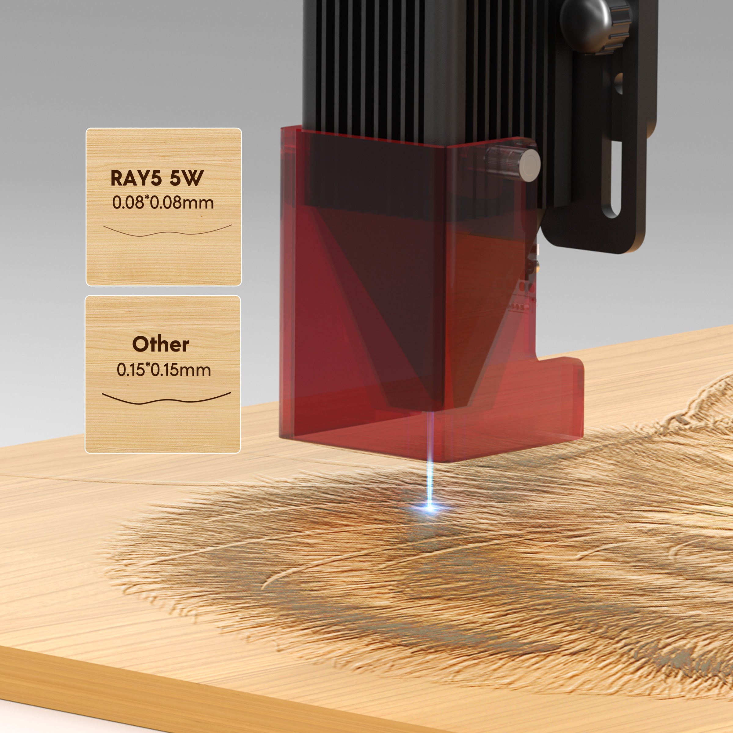 Ray5 5W laser engraver has a strong 5.5W output power and adopts the latest laser FAC compressed technology, the laser spot size is 0.08*0.08mm, which makes engraving or cutting more strong and precise. The engraving speed can reach up to 10000 mm/min
