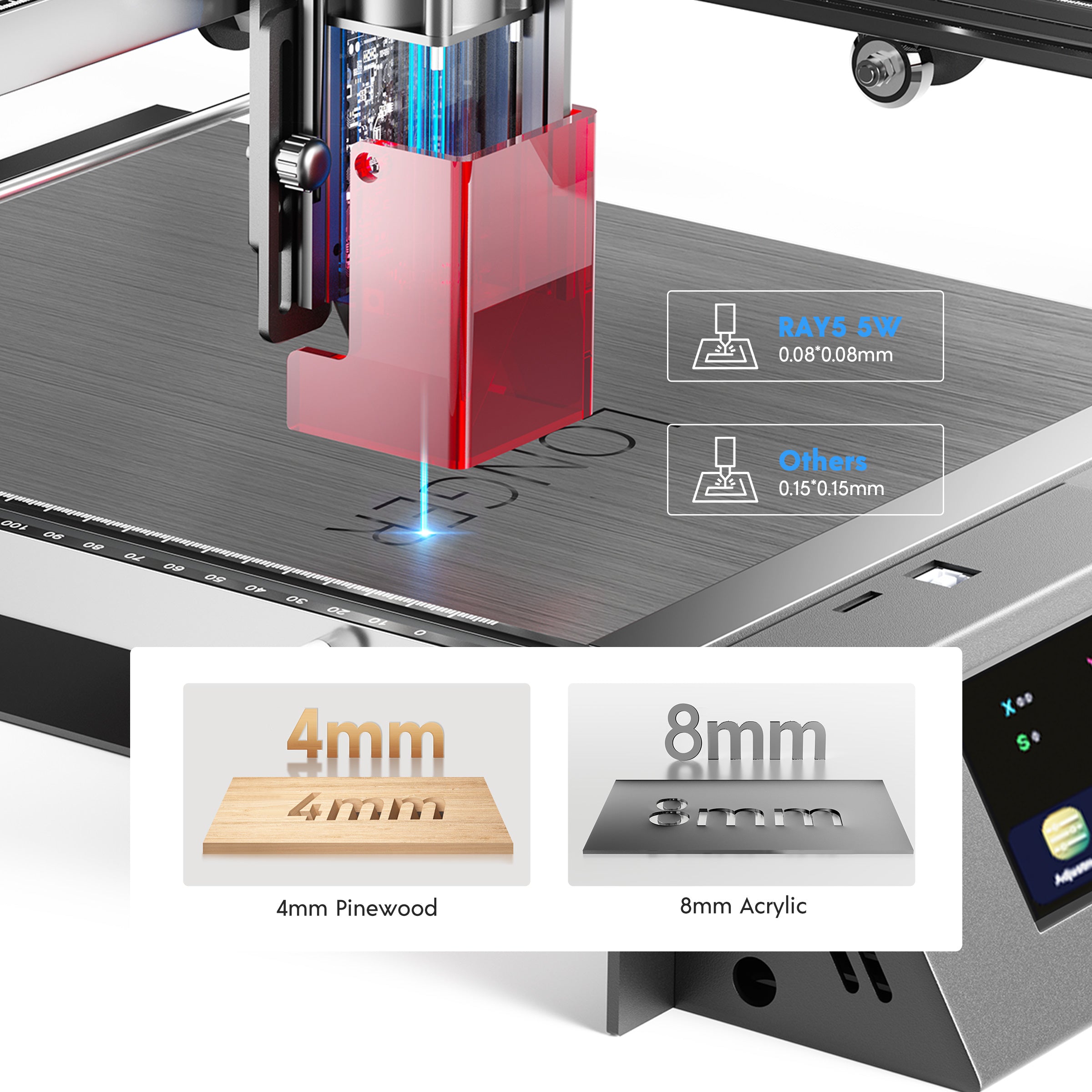 RAY5 20W maximum cutting capacity is 25mm Pine wood and 35mm Acrylic, 0.05mm stainless steel